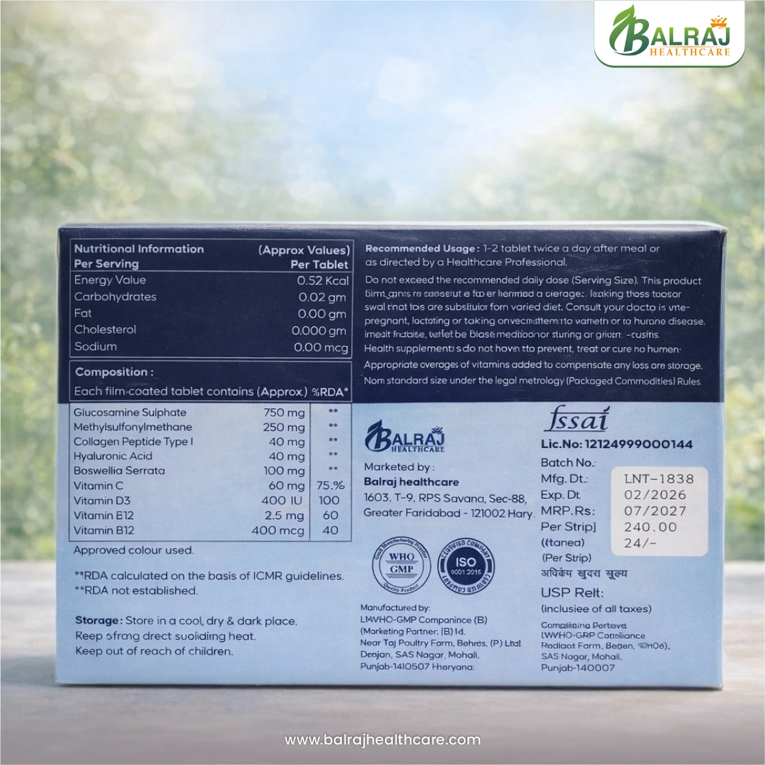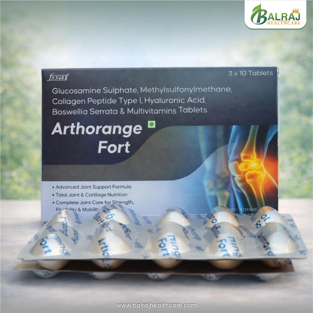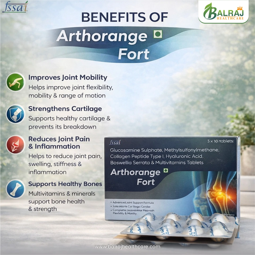 Arthorange Fort is a comprehensive joint support supplement formulated with Glucosamine, MSM, Collagen Peptide, Hyaluronic Acid, Boswellia Serrata, and essential vitamins like C, D3, B12, E, and A. It helps reduce joint pain, stiffness, and inflammation while improving flexibility, mobility, and cartilage health. Ideal for individuals with joint discomfort, active lifestyles, or age-related mobility issues, it also supports bone strength and tissue repair. Take 1–2 tablets twice daily after meals or as directed by a healthcare professional. Store in a cool, dry place and keep out of reach of children.