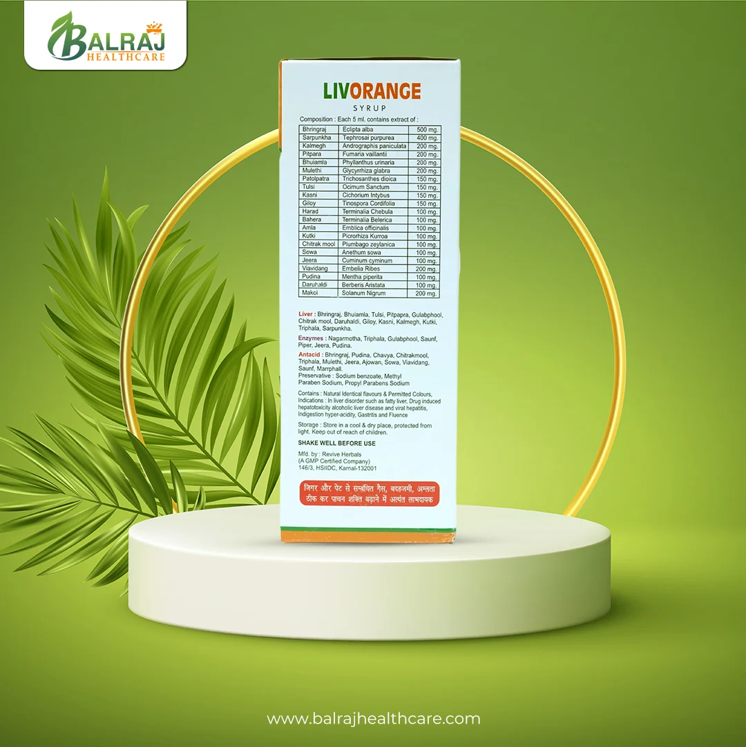 Say goodbye to liver fatigue and poor digestion with Livorange Ayurvedic liver and anti-gastric syrup with essential herbs, a potent yet gentle herbal formulation crafted to detoxify, strengthen, and rejuvenate your liver naturally. Enriched with time-tested Ayurvedic ingredients like Kalmegh, Bhumiamla, Giloy, and Kutki, it helps purify the blood, improve appetite, and boost metabolism while supporting overall liver wellness. Ideal for daily use to maintain a healthy and active lifestyle.