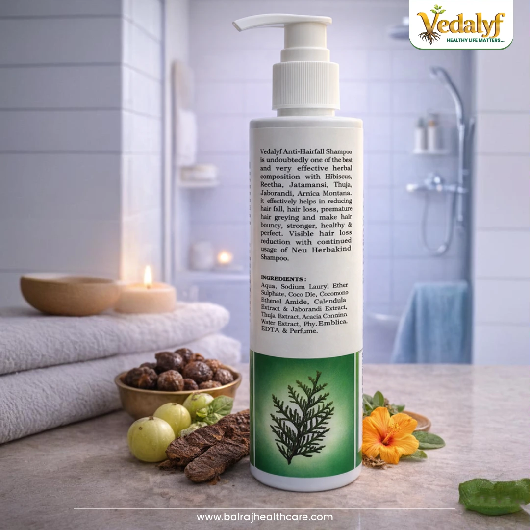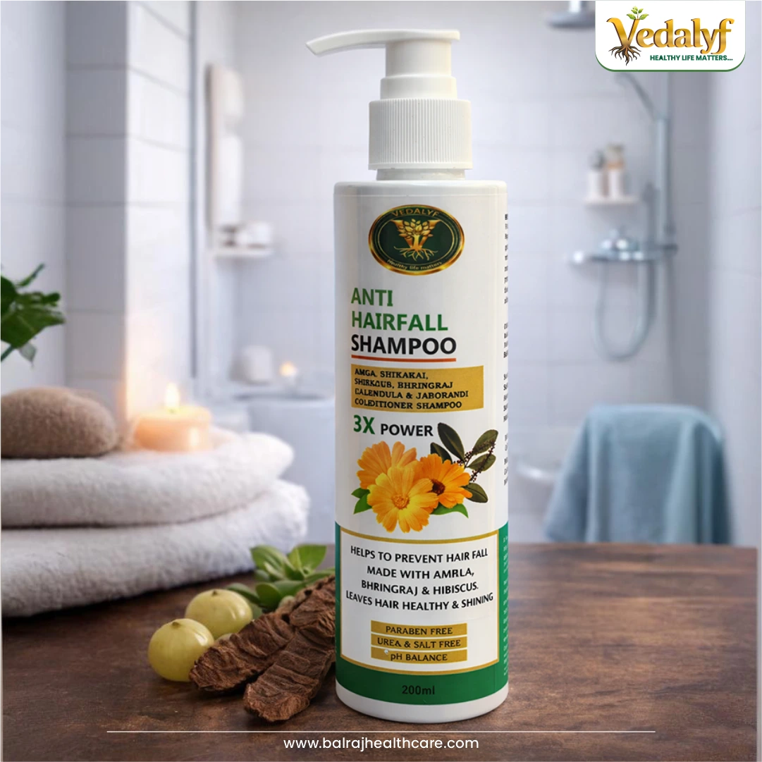 Vedalyf Anti Hairfall Shampoo is a herbal formulation enriched with powerful botanical extracts like Amla, Bhringraj, Hibiscus, and Jaborandi. It helps reduce hair fall, strengthens roots, and promotes healthy, shiny hair. Its gentle cleansing formula supports scalp nourishment while maintaining natural moisture balance
